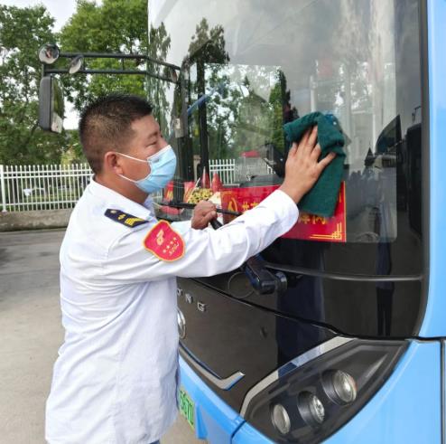 在淮海文博園公交樞紐站內(nèi),81路駕駛員謝新建正在車(chē)廂內(nèi)消毒,中午的車(chē)場(chǎng)經(jīng)過(guò)烈日炙烤,地表溫度有50多度,為了能給乘客提供一個(gè)舒適、安全的乘車(chē)環(huán)境,謝新建每班發(fā)車(chē)前都會(huì)提前上車(chē)檢查車(chē)輛設(shè)施設(shè)備、將車(chē)廂內(nèi)外打掃干凈,提前打開(kāi)空調(diào),身上衣服濕了又干、干了又濕······