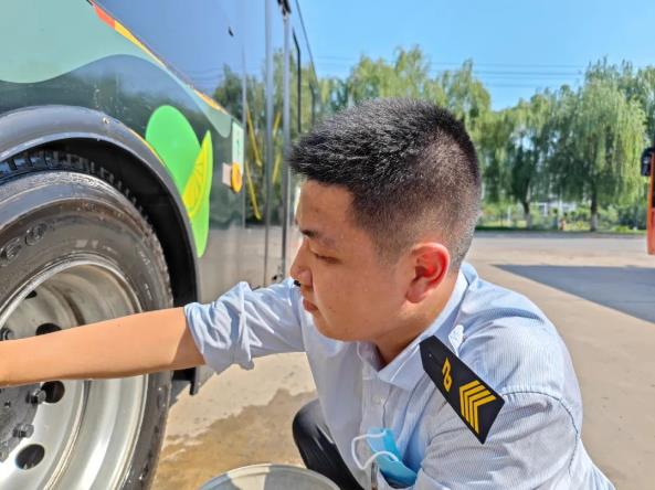 “衣服都濕透了,別弄了,先歇歇吧。”“沒(méi)事,我把衛(wèi)生弄好了就去?!?.....眼前這個(gè)小伙是603路的張?zhí)祧危弥萃r(shí)間,他一邊用布擦拭著輪轂,一邊用手擦拭臉上的汗珠。忙完后,發(fā)現(xiàn)發(fā)車(chē)時(shí)間已到,他立即回到駕駛室,等待乘客的到來(lái)和發(fā)班指令,沒(méi)來(lái)得及喝上一口水。