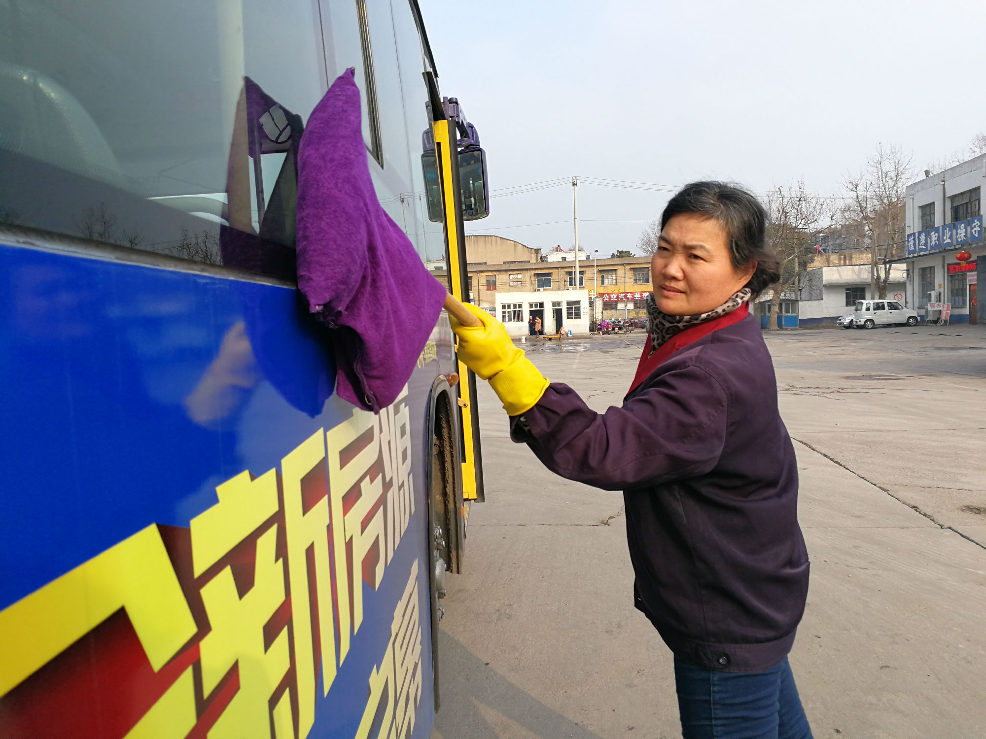 清晨5點,74路保潔員韓黎明已經(jīng)來到韓山車場,開始保潔車輛。由于氣溫較低,車場內(nèi)的水龍頭凍壞了,無法正常使用,她只好到遠(yuǎn)一點的地方,將水一桶桶的運來,開始細(xì)心地擦拭玻璃,車輛外圍,車內(nèi)座椅、內(nèi)圍板....不放過一處角落。冬天的水冰涼刺骨,清洗抹布的手凍得通紅,搓搓手、跺跺腳,她又賣力的干了起來。車窗玻璃上厚厚的霜十分難擦,加上道路上經(jīng)常遇到灑水車,跑完一圈回來車身又臟了,增加了車輛保潔難度。韓黎明不怕辛苦,任勞任怨,只要有臟的地方,她就再次清潔,確保出場的每輛車都干干凈凈。期間,她的衣服多次被汗水浸透,晾晾汗,又凍得發(fā)抖,韓黎明沒有抱怨,仍然堅守完成自己的工作。