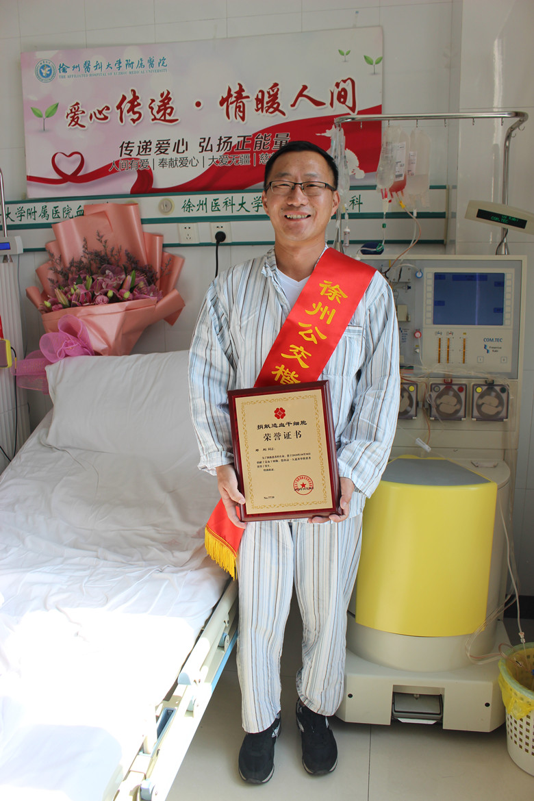打過8針造血干細胞動員劑,10月30日上午開始采集?!袄习郑佑?!”兒子在病床前給鄭剛鼓勁兒,雖然經過了幾天動員針的不適反應,此時鄭剛依舊很堅定:“我比別人的打針反應大,只要能救人一命,這都不算啥,我現(xiàn)在就希望孩子能盡快康復。”徐州市紅十字會副會長李永衛(wèi)為鄭剛頒發(fā)了“捐獻造血干細胞榮譽證書”,為他點贊:“你是英雄!”患者家人在感謝信中寫道:“您這種高尚的壯舉給了我們全家生活的希望?!?/span>