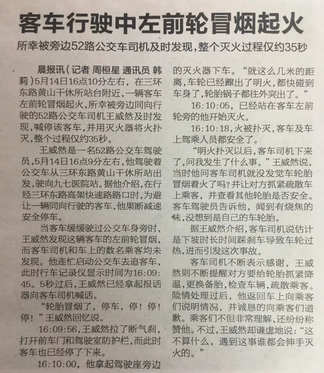5月14日16點(diǎn)10分左右,在三環(huán)東路黃山干休所站臺附近,一輛客車左前輪冒煙起火,所幸被旁邊同向行駛的52路公交車司機(jī)王威然及時(shí)發(fā)現(xiàn),喊停該客車,并用滅火器將火撲滅,整個(gè)過程僅約35秒。