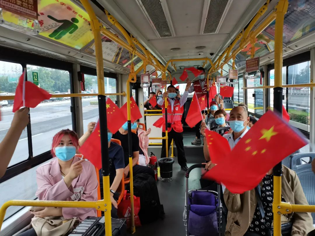 志愿者們走進(jìn)公交車廂,現(xiàn)場與乘客們互動,通過提問節(jié)日和防疫小知識,獎(jiǎng)勵(lì)口罩、紅旗、鑰匙環(huán)等小禮物,并與市民乘客們共唱《我和我的祖國》,熱鬧歡慶的氣氛感染了整個(gè)車廂,彰顯了奉獻(xiàn)、友愛、互助、進(jìn)步的志愿精神。