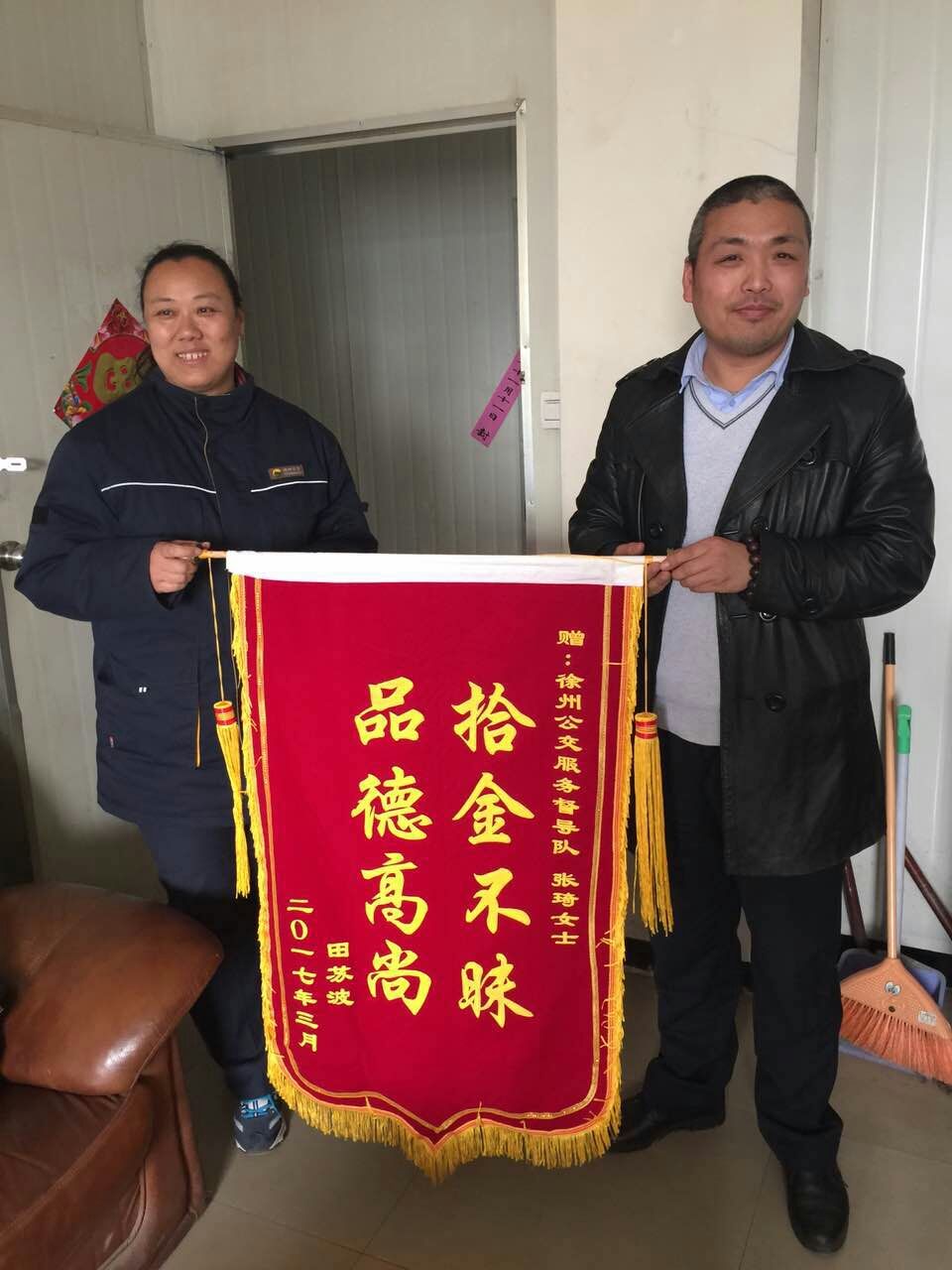 3月29日,正在站臺執(zhí)勤的督導(dǎo)員張琦撿到乘客掉落的公文包,經(jīng)查看發(fā)現(xiàn)包內(nèi)有蘋果筆記本一臺和一個錢包,但并沒有找到皮包主人的聯(lián)系方式。張琦把包放在了調(diào)度室等待失主來認(rèn)領(lǐng),約一小時后失主匆忙趕來尋找。失主見到失而復(fù)得的皮包非常激動,經(jīng)過詢問得知失主姓田在徐州礦業(yè)大學(xué)工作。田先生說,“電腦里存有非常重要的資料和聯(lián)系方式,丟包之后萬分焦急,真心感謝公交督導(dǎo)員?!彪S即從錢包里拿出400元錢塞給張琦作為答謝,張琦表示:“路不拾遺本就是自己的義務(wù),作為站臺督導(dǎo)員經(jīng)常會在站臺撿到乘客掉落的物品,不管東西貴重與否我們都會幫失主妥善保管等待認(rèn)領(lǐng)?!?/span>3月31日,田先生和他的愛人送來錦旗表示感謝!