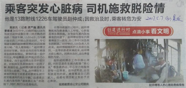 當天中午,13路附線1226車駕駛員趙仲成像往常一樣在熟悉的線路上駕駛車輛。12點54分,當車輛行駛至西三環(huán)銅山貨場站時,專心駕駛車輛的趙師傅忽然聽到后面乘客大喊:“有人暈倒啦”,趙師傅立即停好車輛、快步走向后排車廂查看發(fā)病乘客情況,暈倒的是一名中年婦女,呼吸微弱、輕聲地說自己心里難受。由于趙師傅出生在中醫(yī)世家,對疾病及急救措施有一定的了解,根據(jù)經(jīng)驗,趙師傅判斷該名乘客是忽發(fā)心臟病,于是,趙師傅在車上乘客的幫助下將患者轉移到車廂中部寬敞通風的地方平躺,迅速拿出車廂內備用的“速效救心丸”給她服下,同時,撥打120急救電話。在等待救援的過程中,趙師傅熟練地為患者做人工呼吸、心肺復蘇等急救措施。在爭取車廂內其他乘客的同意下,趙師傅安排車內乘客乘坐下一班車,自己等待120急救車的到來。10分鐘后,120急救人員趕來,趙師傅跟隨醫(yī)護人員前往醫(yī)院,一直等到患者家屬趕來,趙師傅才放心的離開。