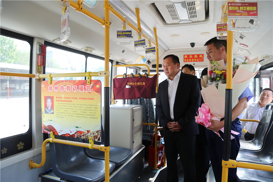 杜紅軍一行首先來到韓山終點(diǎn)站,剛行駛完一趟的市勞模、49路線駕駛員王博正利用休停時(shí)間打掃車輛,杜總走上前親切地與王博握手,并把一束嬌艷芬芳的鮮花和勞模慰問金送到他手中。