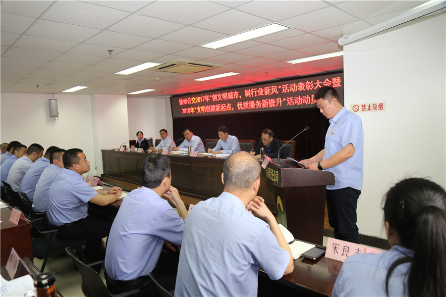 調研員祖伯鴻宣讀了《關于表彰2017年度“創(chuàng)文明城市、樹行業(yè)新風”先進集體和先進個人的決定》。大會對獲得榮譽的先進集體和個人代表進行了頒獎。新區(qū)公司黨支部書記李強、順通公司三車隊隊長鹿小可、11路駕駛員曹瑞國等三位同志作了大會交流發(fā)言。